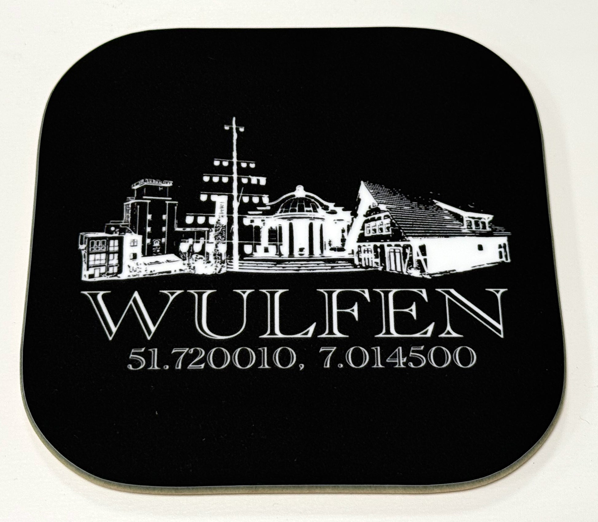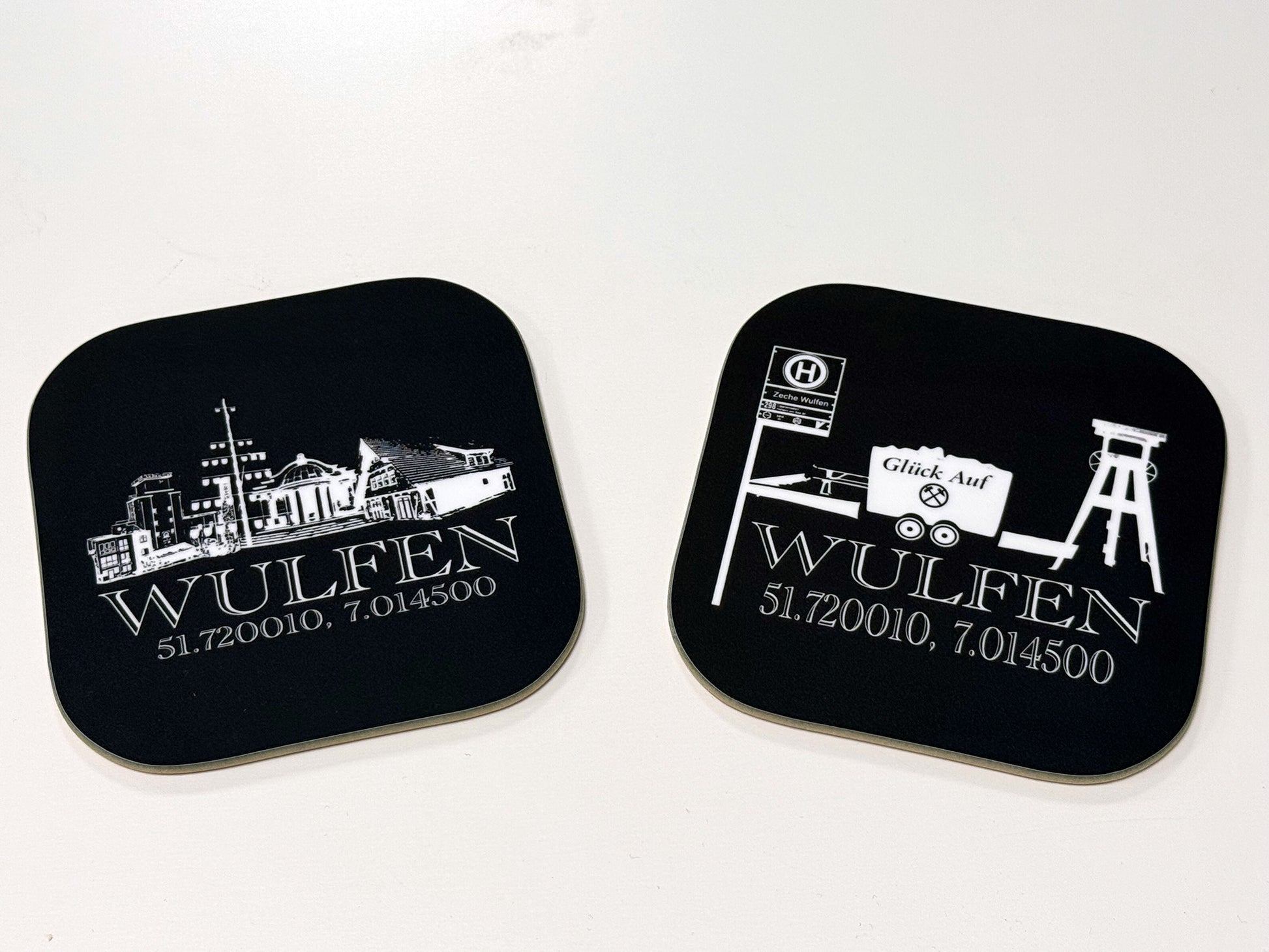 Das Highlight ist der hochwertige weiße Druck auf schwarzem Untergrund: wahlweise mit der einzigartigen Wulfen-Skyline oder der „Lore“ vom Wappenbaumplanz. So wird jeder Untersetzer nicht nur zum praktischen Alltagshelfer, sondern auch zu einem dekorativen Hingucker mit lokalem Bezug.